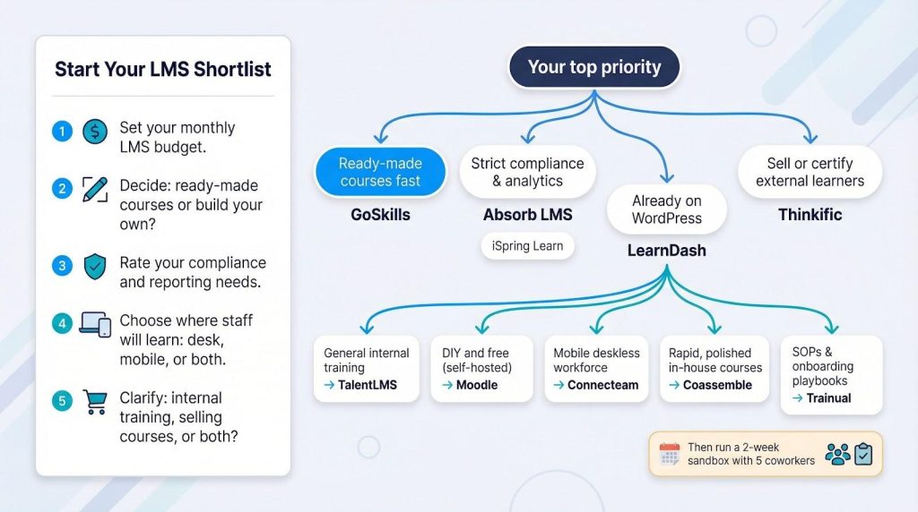 There is no universal winner. If you need courses ready out of the box, GoSkills leads. For strict compliance, choose Absorb. Running on WordPress? LearnDash integrates naturally. List your top two must-haves, often content-creation effort and reporting depth, then select the platform that covers those first.