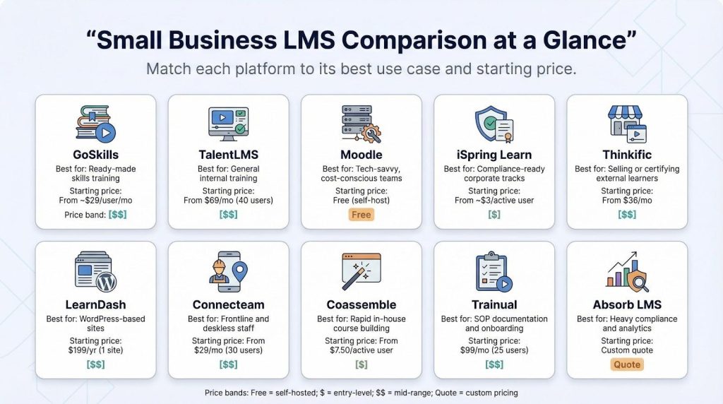 | iSpring Learn | Compliance-ready corporate tracks | About $3 per active user per month | Yes | PowerPoint-to-course authoring | Fewer native integrations |