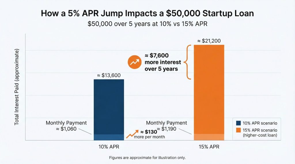 Take a $50,000 loan for 5 years. At a 10 percent APR, the monthly payment is roughly $1,060. Raise the rate to 15 percent and the payment climbs to about $1,190. That extra $130 per month adds up to nearly $7,600 in additional interest over the life of the loan. Small change, big cost.